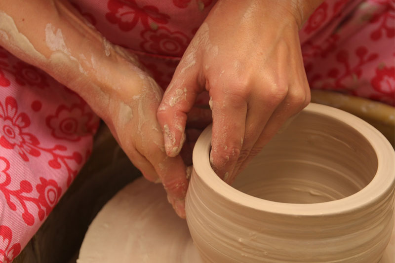 Een urn maken we met de hand of op de draaischijf. Wanneer de klei ‘leerhard’ is kunnen we de urn verder in vorm brengen en er de ornamenten of stuctuur op aanbrengen. Daarna kan de klei langzaam drogen om voor de eerste maal gebakken te worden. De klei heeft dan zijn bijna definitieve vorm te pakken.